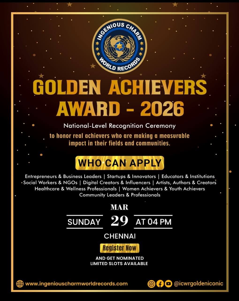 🎉 Don’t miss this prestigious event! Register your nomination today and become a part of the ICWR Golden Achievers Award 2026!